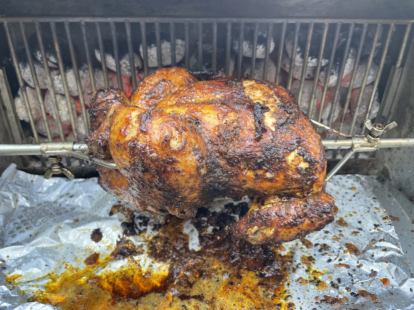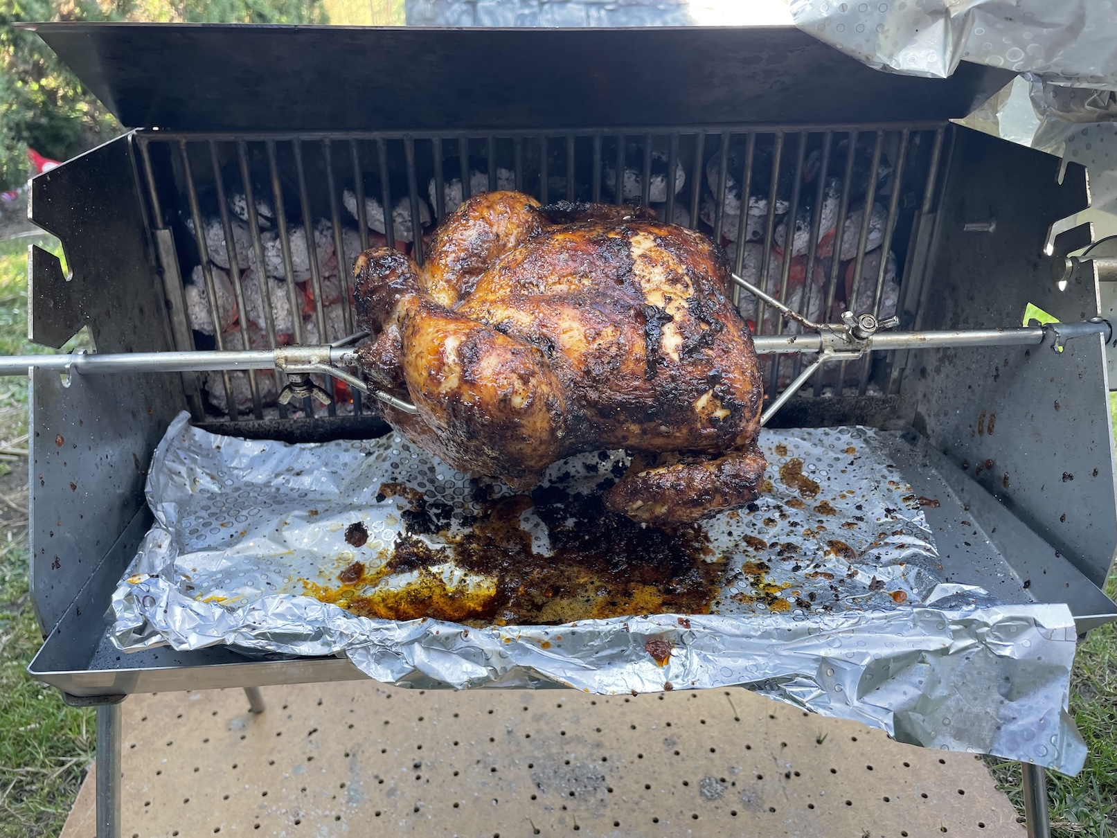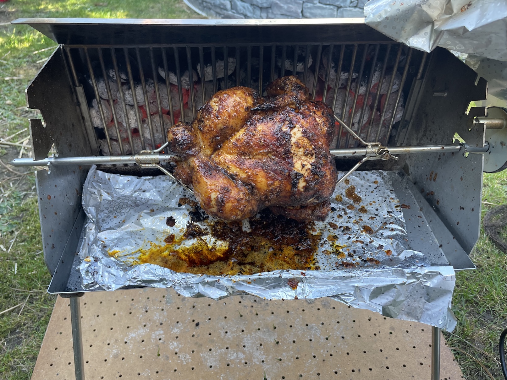 Hodně důležité je pořádné rozpálení grilu. Uhlí si vždy rozpalujeme pomocí horkovzdušné pistole. V podstatě skoro celé topeniště musí mít ve finále šedou barvu. Uhlí musí být zkrátka pořádně žhavé, aby se kuře dokonale opeklo. Kuře se musí po celou dobu točit a nezastavovat jinak se může velmi rychle spálit, což si samozřejmě nepřejeme. Zpočátku zakrýváme gril alobalem, aby byla teplota uvnitř vyšší. Kuře také po celou dobu pravidelně potíráme marinádou, která nám odkapává do spodní části grilu.