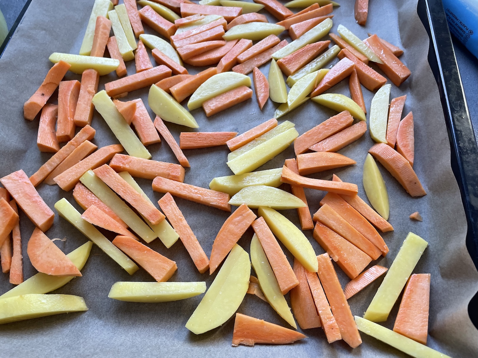 Jako přílohu jsme zvolili batátové a bramborové hranolky pečené v troubě. Jejich příprava ej velmi jednoduchá. Stačí pouze brambory a batáty podélně nakrájet na hranolky. Přidali jsme trochu soli a klasického řepkového oleje. Následně jsme hranolky rozprostřeli na plechu a pekli v troubě. Ke kuřeti jsme ještě připravili klasický zelný salát z čerstvého zelí.