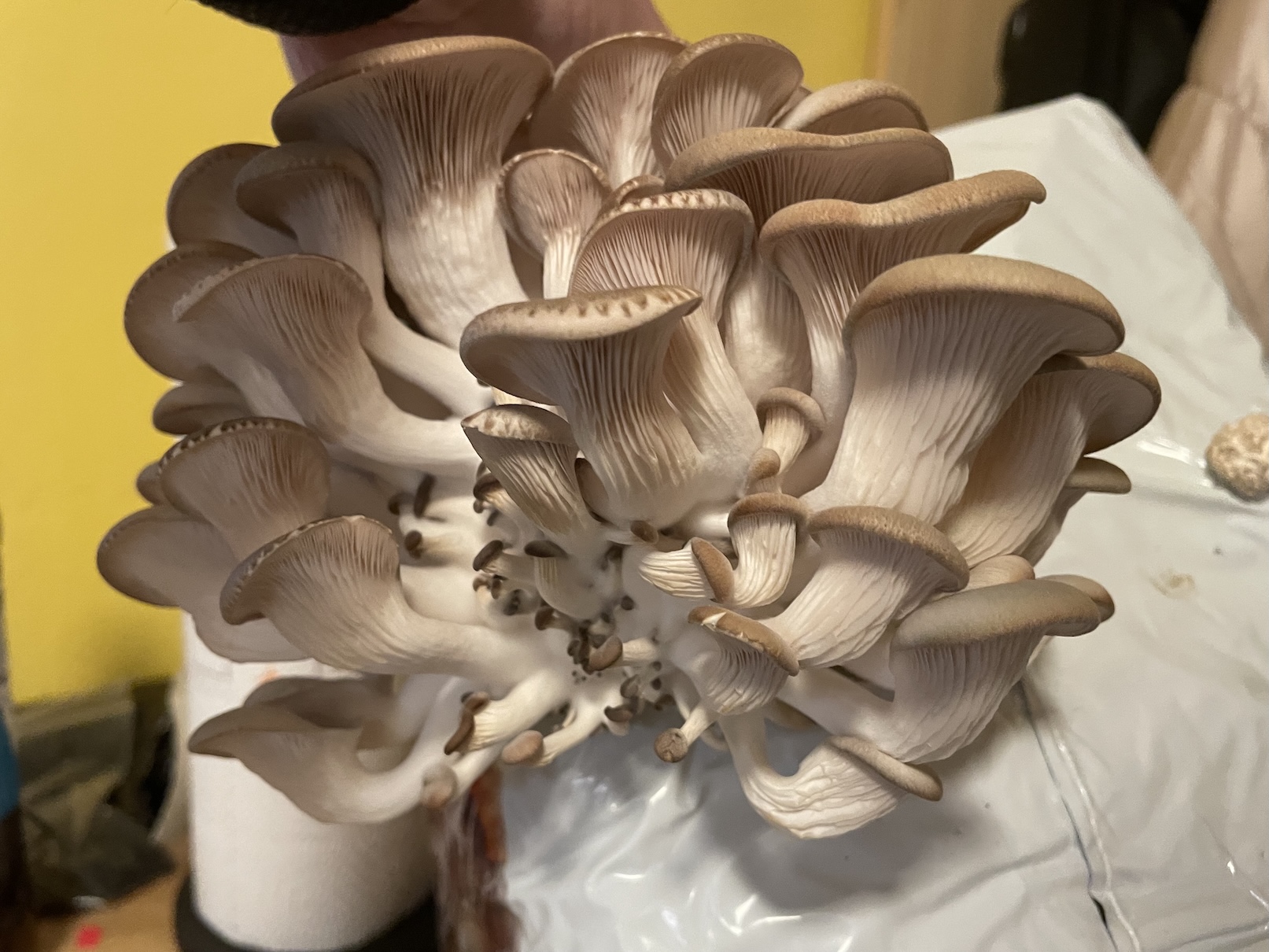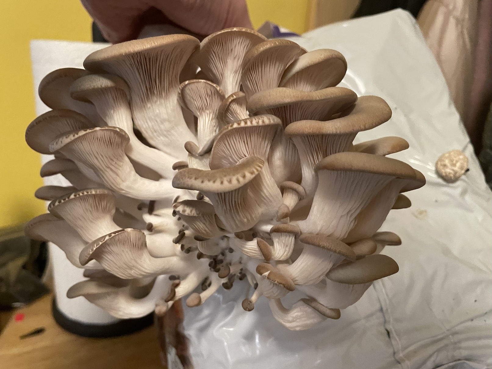 My jsme na první úrodu čekali zhruba týden a pár dnů. Sadba je už přímo naočkovaná, takže ji stačí pouze umístit do nějakého prostoru s pokojovou teplotou. My ji máme v malé technické místnosti a daří se jí skvěle. Když jsme se dočkali první úrody, stačilo pouze trs odříznout přímo u samotného obalu. V první várce jsme měli dva trsy hlívy ústřičné. Pak už jsme čekali na druhé kolo.