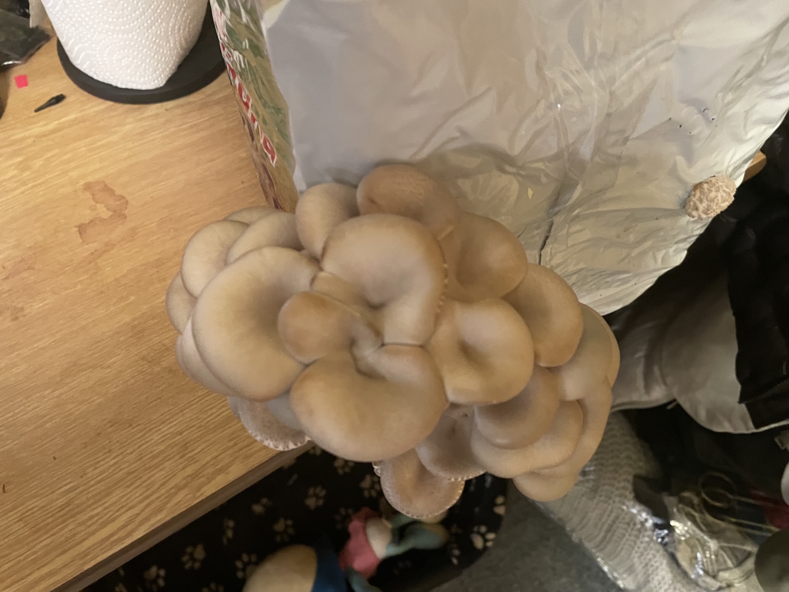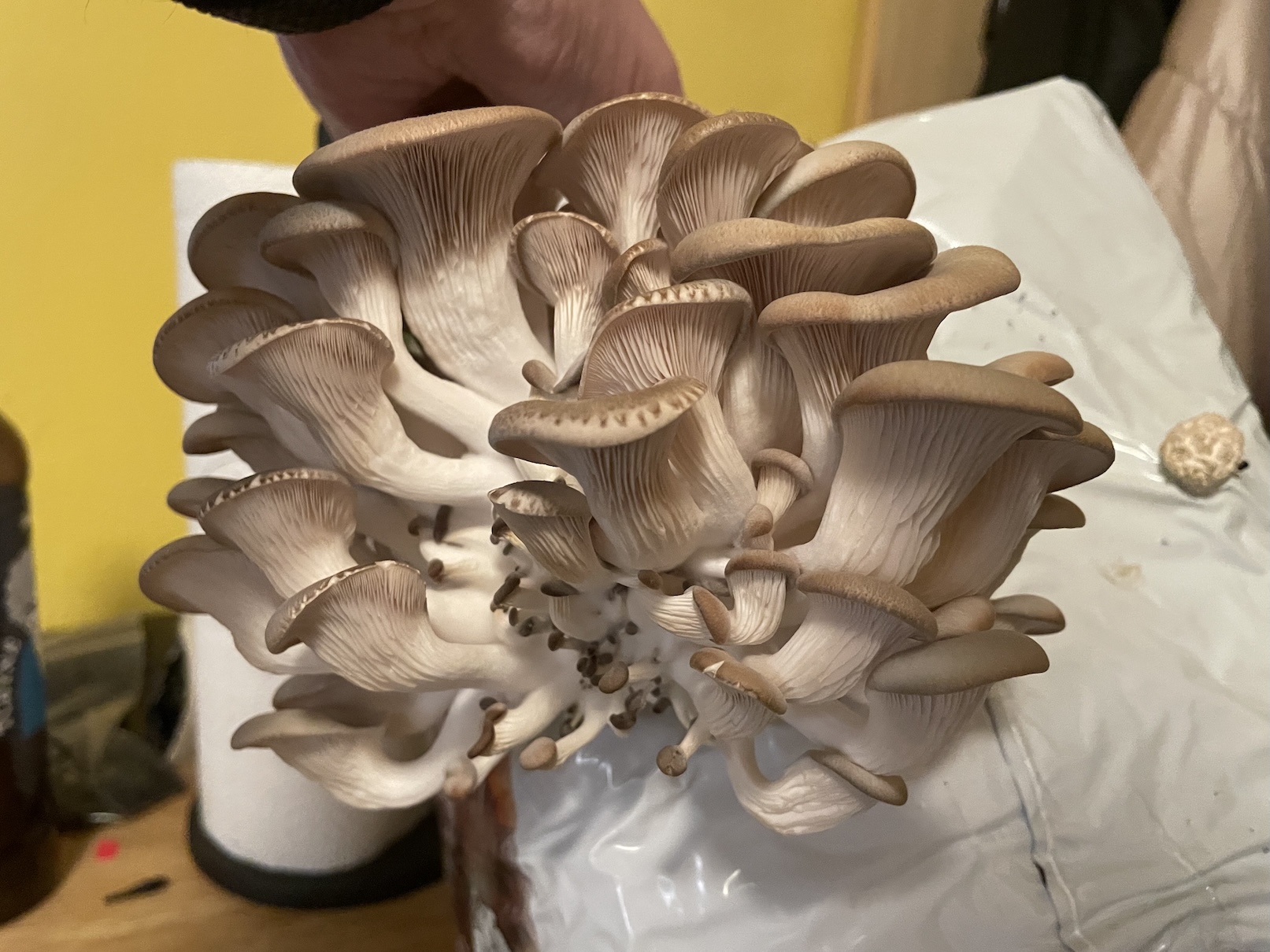 V rámci druhé sklizně jsme měli nyní pouze jeden trs. Ostatně přesvědčit se můžete sami. Nejspíše to bylo dáno tím, že se v blízkosti sadby nacházelo topení. Teplota v místnosti se tak rapidně zvýšila a vlhkost z balíku se zřejmě odpařila. Těžko říct. Určitě je ale důležité, aby se sadba hub nacházela dál od topení. Pokud tomu tak není, plodnice jsou viditelně vyschlé, což je špatně. My jsme se těšili z poloviční úrody, která stála za to. Houby nejspíše půjdu pod maso a do dršťkové polévky z hlívy.