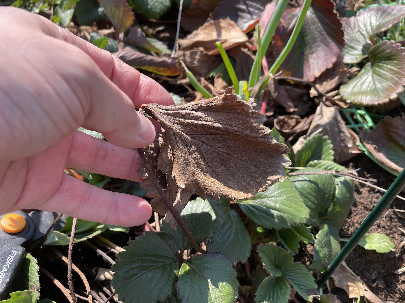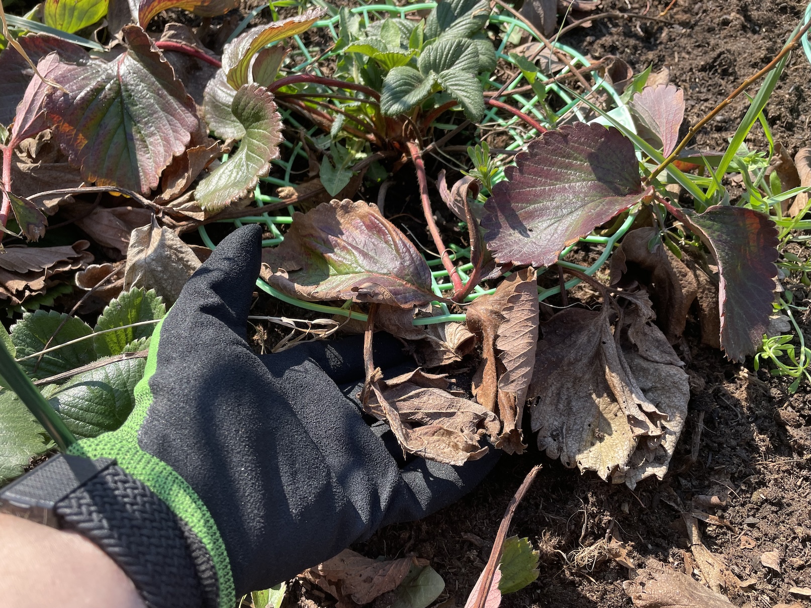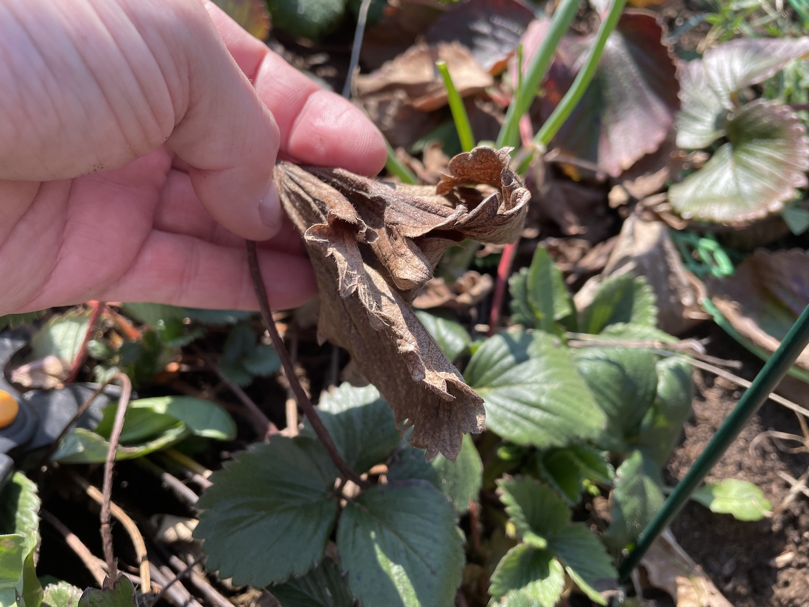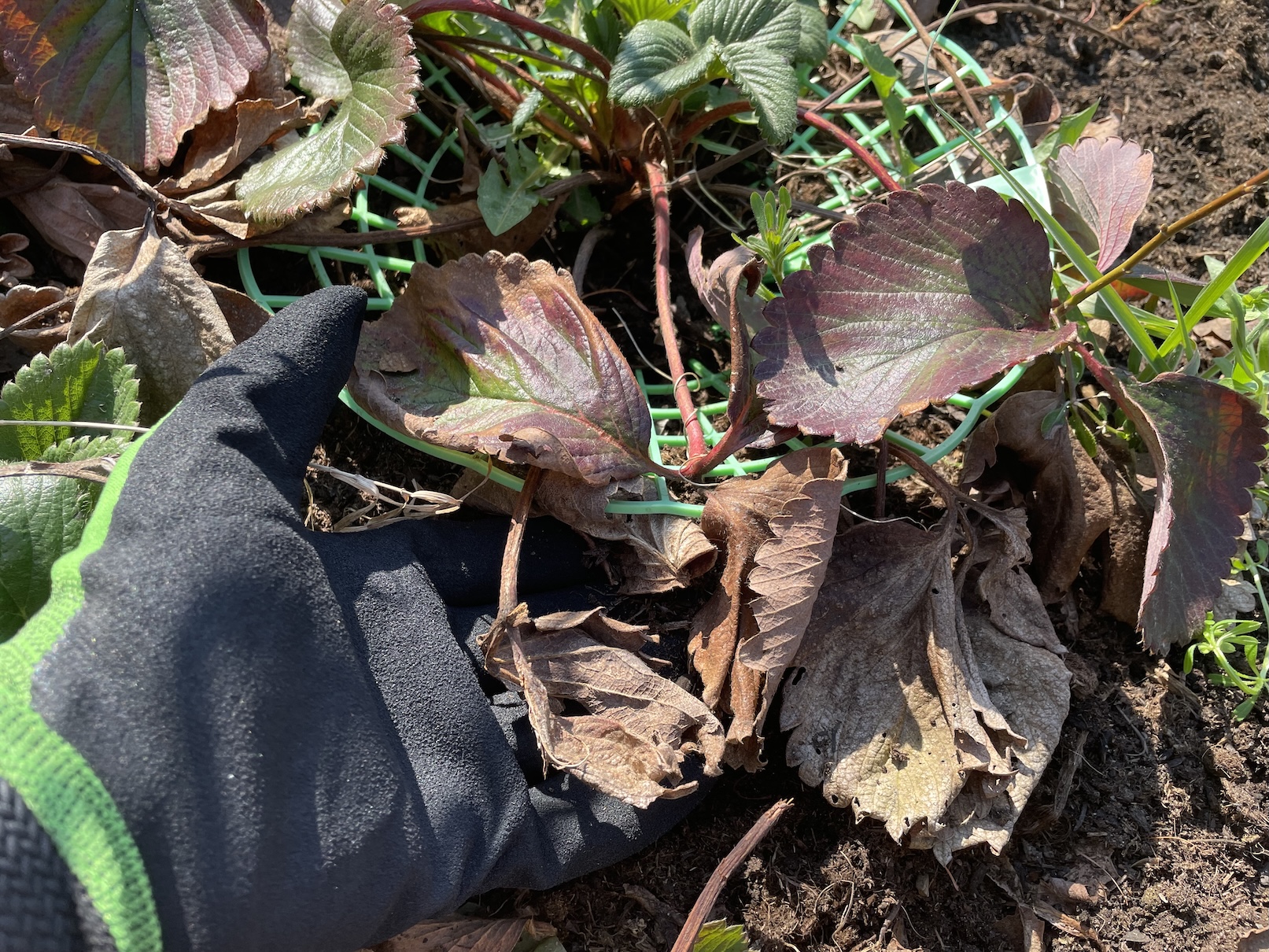 Jakékoli poškozené části jahodníků musí pryč, a to neprodleně. Může se jednat o listy zčernalé, úplně hnědé nebo se v prostoru jahodníků nachází ještě starý mulč. Ostatně právě on se může stát nepříjemným zdrojem plísní, chorob a jiných nepříjemností. Na poničené části jahod stačí obyčejné zahradnické nůžky, zbytky ze záhonu dostaneme pryč i pomocí rukou na nichž máme samozřejmě rukavice.