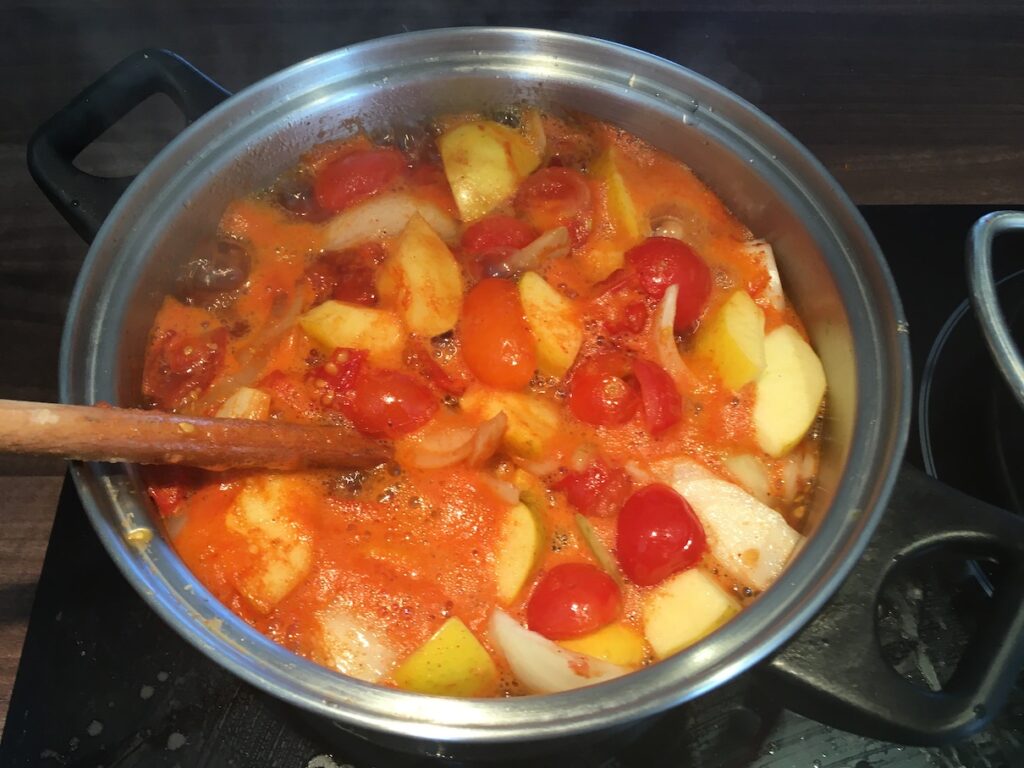 Přesně tak, nejprve nakrájíte do hrnce rajčata, poté cibuli a jablka. Můžete v klidu nechat vařit a postupně přidávat další koření včetně soli a cukru. Nakonec si z plátýnka uděláte balíčky plné dalšího koření. Důvod je jasný. Kdybyste hřebíček, nové koření a bobkové listy dali přímo do směsi, jejich lovení by bylo neskutečně náročné.