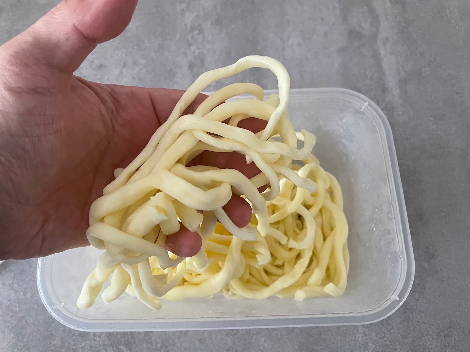 Před taháním si připravíme jeden hrnec s vodou kolem 80 stupňů Celsia a druhý se studenou vodou. Dále musím mít misku se slanou převařenou vodou. Tradičně dáváme 250 gramů soli na 1 litr vody. Sýrové těsto si nejprve nakrájíme na malé kousky. Hrst kousků dáme do sítka, jež ponoříme do horké vody. Postupně se nám vytváří těsto, jež hněteme. Když máme foremný kus těsta, začínáme z něj pomalu tahat nitě do studené vody. Tady chvíli zůstanou, než budeme mít další kousek těsta. Pak budou již hotové nitě odpočívat v solné lázni zhruba 10 minut. A je hotovo. O výsledcích se můžete přesvědčit sami.