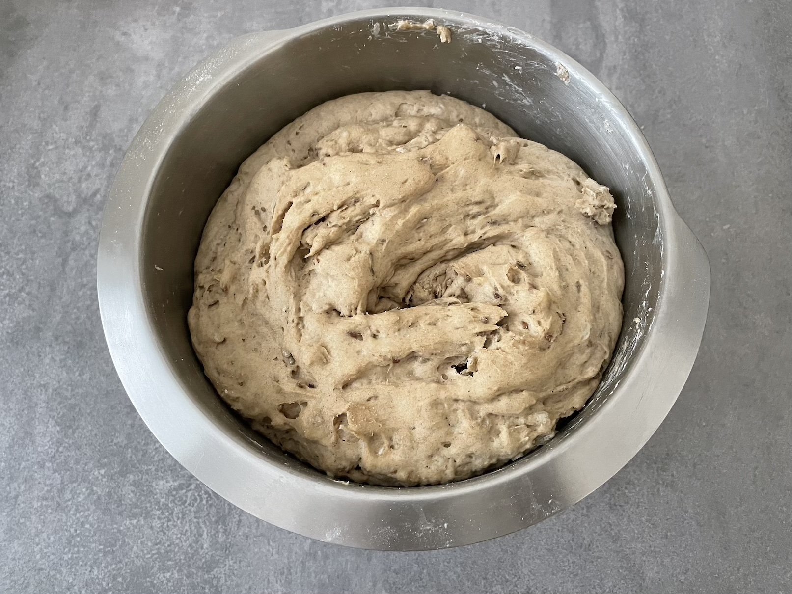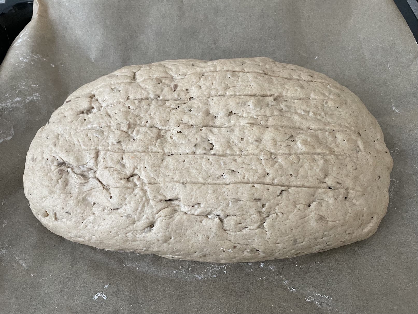 Ideální ne nechat těsto vykynout klidně i hodinu. Mělo by dokonale poskočit. Když vykyne, tvoříme z něj pecen, který necháme ještě zhruba půl hodiny kynout. Pak už může do trouby.