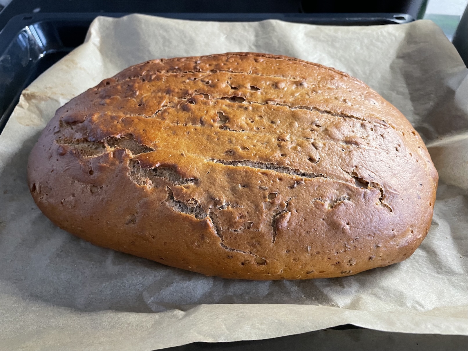 Pro upečení chleba používáme parní troubu. Skvělá je v tom, že dokáže vytvořit na chlebu krásnou kůrku a dá mu dokonalou barvu. U klasické trouby se nám to nedařilo. Pekli jsme 1 hodinu a 6 minut. Teplotu nám trouba neukazovala, nicméně v klasické šlo o 200 stupňů Celsia.